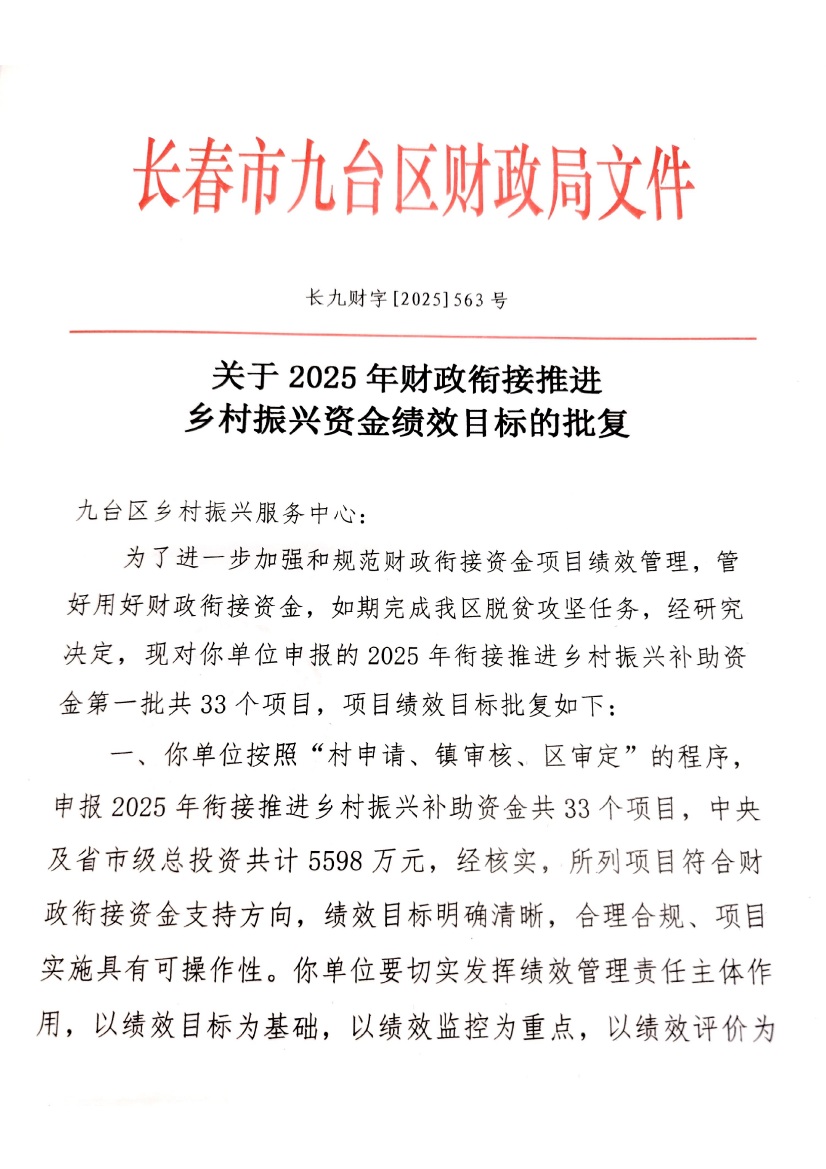 长春市九台区财政局关于2025年衔接资金项目绩效目标的批复